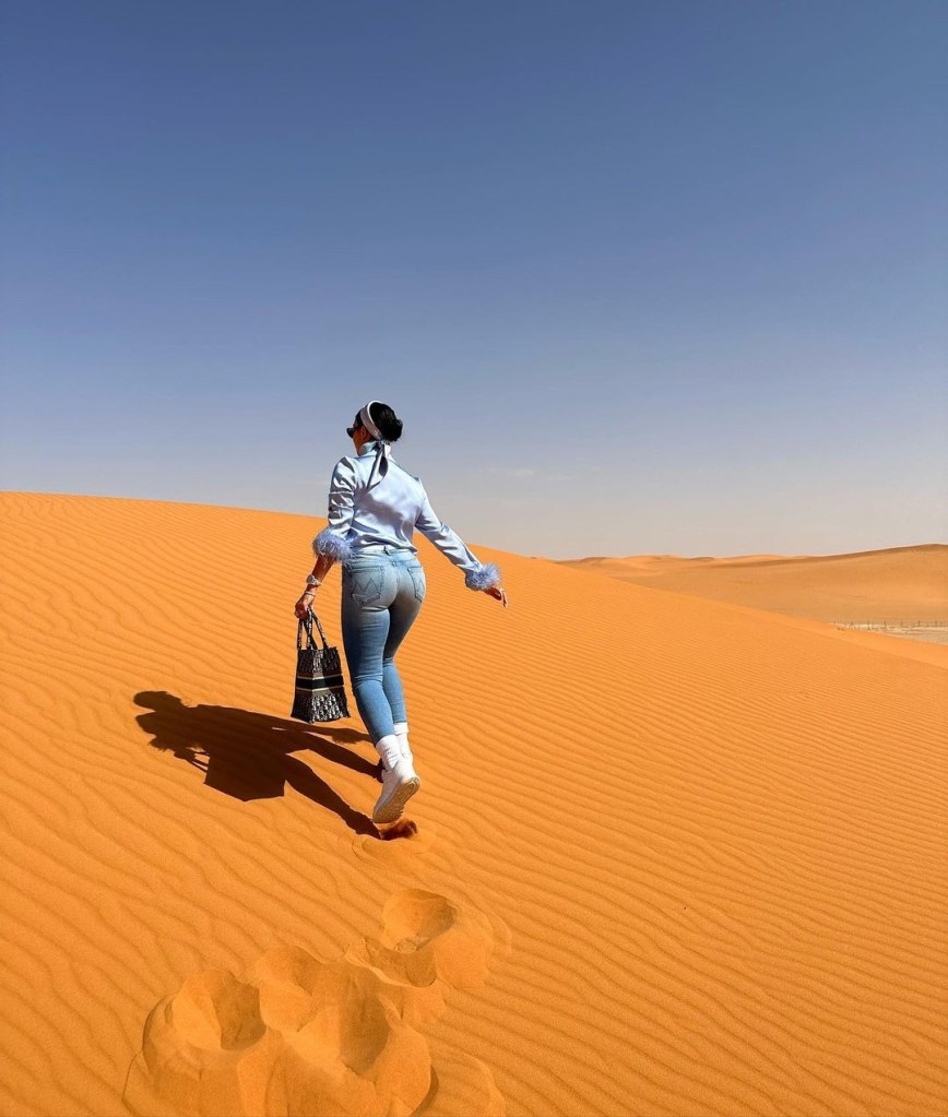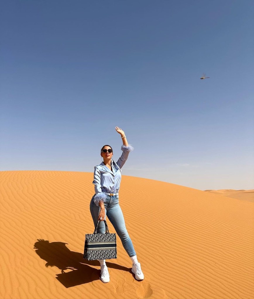 ومن ثم رأيناها تتجول في الرياض مرتدية بنطلون جينز مع بليزر و حذاء بوت كعب عالي لتكون ثاني مرة نراها تتألق باطلالة الجينز باسلوب ملفت وجذاب. ولم تستغني عن اكسسوارها المفضل، حقيبة Hermes Birkin من الجلود الغريبة باللون الأسود.