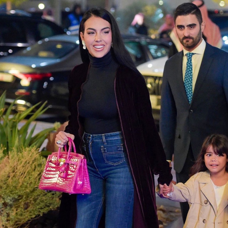 أول ظهور لجورجينا بالجينز كان أثناء استقبال كريستيانو الرسمي في الرياض بعد الاعلان عن انضمامه إلى فريق النصر السعودي. أدهشتنا جورجينا ببساطة أختيارها لاطلالة مكونة من عباية مخمل باللون البنفسجي الداكن نسقتها مع كنزة شتوية وبنطلون جينز وحقيبة من Hermes بلون انثوي صاخب
