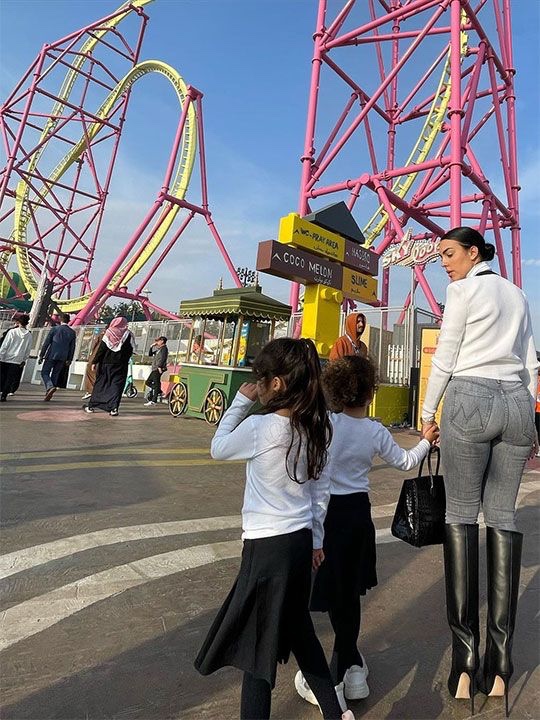 لا تمل جورجينا حبها لاطلالات الجينز مع أحذية البوت الطويلة فقط ظهرت مرتدية هذا التنسيق الذي نراه يتكرر كثيرا في ظهورها أثناء تجولها مع عائلتها في بوليفارد وورلد إحدى مناطق موسم الرياض المميزة
