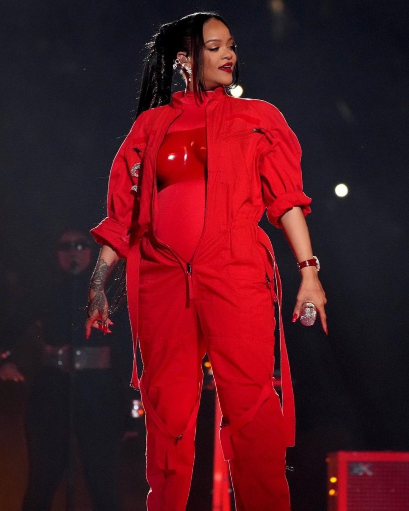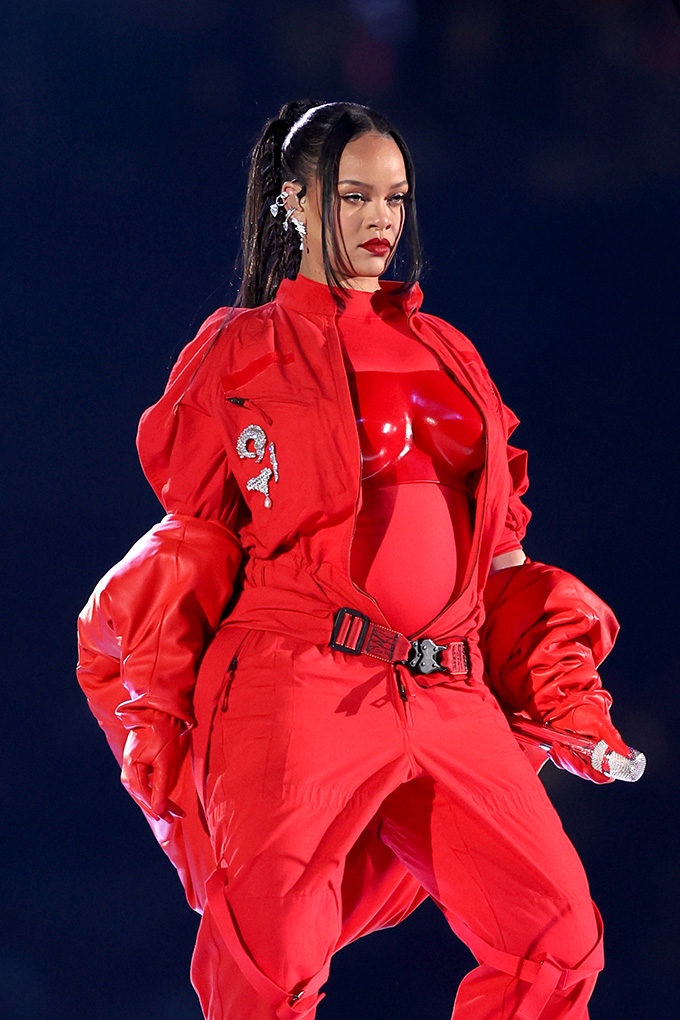 واذا تعمقنا أكثر في موضوع اطلالتها التي اختارتها أثناء هذا الأداء الاسطوري الذي أعلنت فيه عن حملها، نجد أنها انتقت كل قطعة ارتدتها بعناية مطلقة، جمبسوت أحمر وصدرية مصنوعة من اللاتكس من علامة Loewe مع معطف أحمر ضخم من ALAIA نسبة إلى أيقونة الموضة الراحلAndre Leon Talley