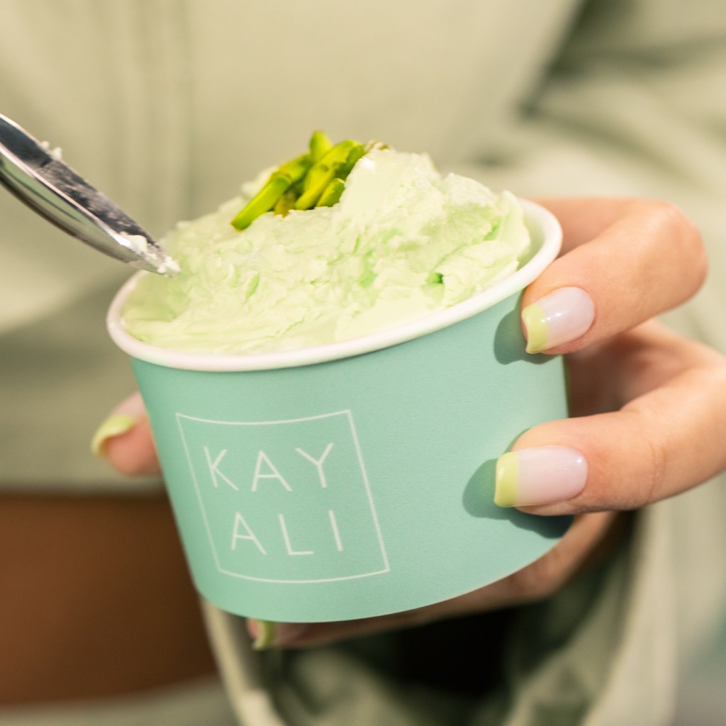 خلال رحلتها القصيرة إلى روما برفقة شقيقتها، بدأت قصّة عشق بلا نهاية بين Mona والجيلاتو بالفستق الحلبي ليصبح هذا الأخير لذّتها المفضّلة. لابتكار العطر الثاني عشر من مجموعة KAYALI، تعاونت Mona مع خبير العطور الزاخرة بالنفحات الشهية، أوليفييه كريسب وابنه سيباستيان، بحيث أصرّت على أن يحاكي عطر Yum Pistachio Gelato | 33 الطابع والقوام والسحر نفسه كالحلوى المفضّلة لديها.