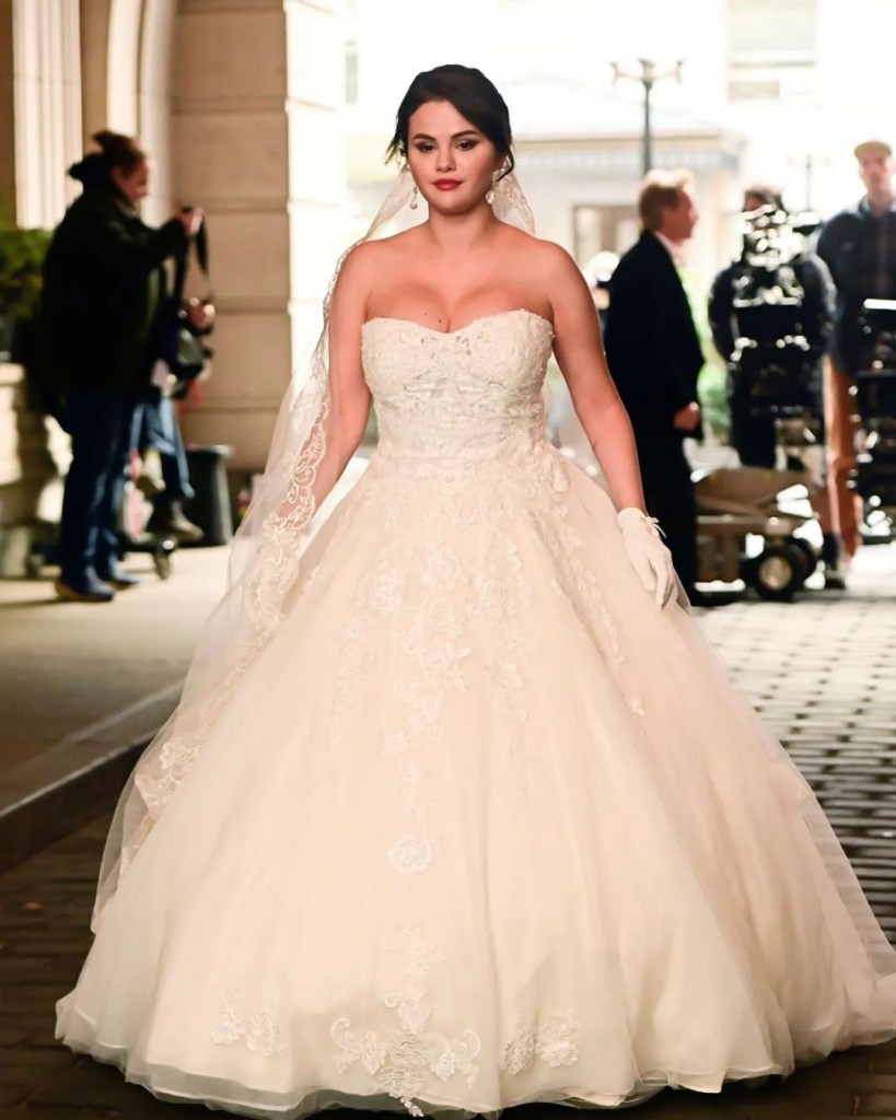 انتشرت صور النجمة العالمية سيلينا قوميز على وسائل التواصل الاجتماعي بإطلالة أثارت فضول المتابعين ومجتمع الفن حيث ظهرت مرتدية فستان زفاف أبيض كلاسيكي بتفاصيل التول والدانتيل .