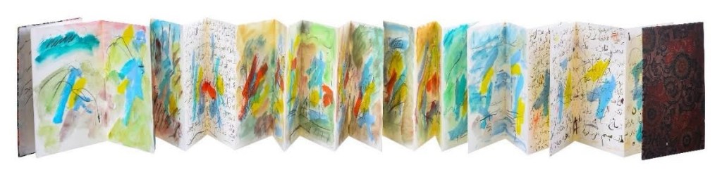 تجسد اللوحة المطوية بعنوان خط ورسم، 1986 للفنانة إيتيل عدنان (في الصورة أدناه) (السعر التقديري 50,000 – 70,000 دولار أمريكي) بشكل جميل قصيدة “محطات ما بعد الموت” من تأليف صديق الفنانة الشاعر العراقي شوقي عبد الأمير. ويصوّر العمل الذي تم إنتاجه في كاليفورنيا خلال ثمانينيات القرن الماضي، أبيات عبد الأمير الشعرية الرقيقة برسومات وكتابات خطتها يد عدنان على 28 صفحة باستخدام الألوان المائية والحبر وأقلام الرصاص الملونة.
