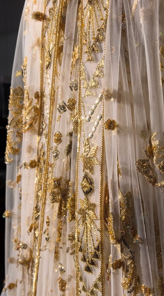 تبلورت التطريزات الذهبية والزخارف الهندسية العربية بتقنية ثلاثية الأبعاد وحُبكت بمزيج من الحرير والخيوط المعدنية وخيوط القصب التقليدية، وقد تم تطريز سبع نجمات حصرياً على طرحة العروس في رمزية إلى النجمة السباعية الأردنية، والرسومات كالنخلة والنجمة السباعية مستوحاة من مزيج بين التراث السعودي النجدي ومن التراث الأردني العريق.