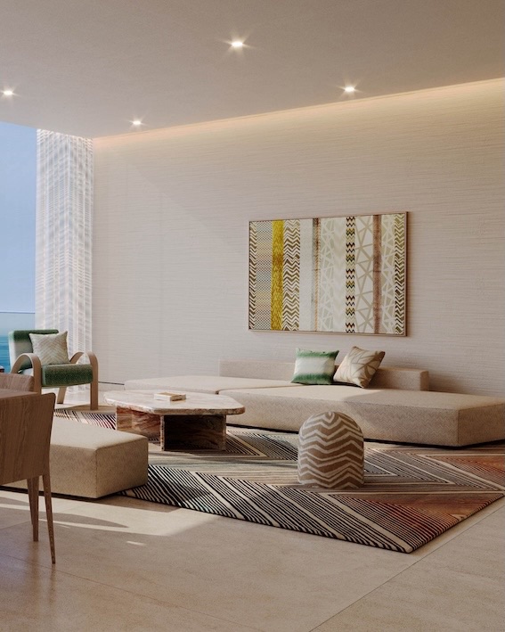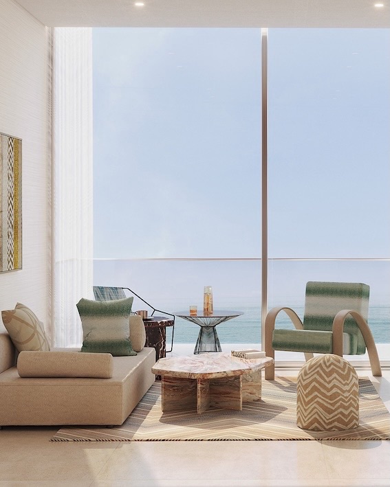 وسيتميز المشروع بتصاميم داخلية عصرية من ميسوني، المعروفة بأسلوبها الفريد الذي يجمع بين الألوان الجريئة والأشكال الهندسية والعناصر البصرية اللافتة.