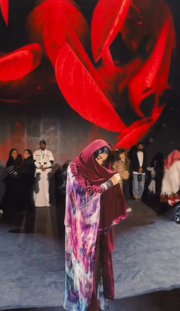على خشبة المسرح، اختارت هيفاء عباية بيضاء مرصعة بتطريزات دقيقة، مع برقع مزخرف يضفي لمسة من الغموض والفن التقليدي، ما خلق توازنًا فريدًا بين الأصالة والحداثة. الإطلالة لم تكن مجرد زي، بل رسالة قوية عن الفخامة العربية المعاصرة، حيث تماوجت حركاتها المسرحية مع تفاصيل العباية والبرقع، لتخلق تجربة بصرية لا تُنسى.