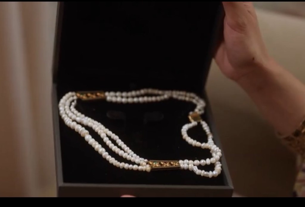 في منشور على حسابها في منصات التواصل الاجتماعية، كشفت فوزية بن خميس، المستشارة الثقافية وباحثة الأزياء التقليدية، عن سر عقد اللؤلؤ الذي ارتدته لمى الكناني في شخصية “عزيزة” بمسلسل شارع الأعشى. العقد لم يكن مجرد إكسسوار، بل قطعة تحمل دقة تاريخية وذكريات خالدة، تجمع بين التراث السعودي والفن البصري على الشاشة.